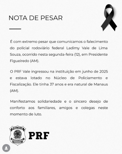 Perfil do agente ─ Ladimy Vale era natural de Manaus e integrava a instituição há pouco tempo. Ele havia ingressado na Polícia Rodoviária Federal na última turma, em junho de 2025. Atualmente, o servidor desempenhava suas funções no Núcleo de Policiamento e Fiscalização, setor responsável pelo patrulhamento direto e combate à criminalidade nas rodovias federais.