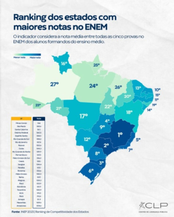 Manaus (AM) – O Amazonas registrou o pior desempenho do país na média das notas do Exame Nacional do Ensino Médio (Enem 2024), conforme o Ranking de Competitividade dos Estados 2025, divulgado pelo Centro de Liderança Pública (CLP).