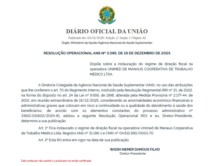Brasília (DF) ─ A Agência Nacional de Saúde Suplementar (ANS) instaurou regime de direção fiscal na operadora de planos de saúde Unimed Manaus, no Amazonas. A determinação consta na Resolução Operacional nº 3.085/2025, publicadas nesta segunda-feira (05/01), no Diário Oficial da União (DOU).