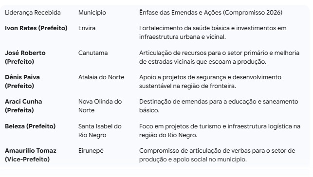 A reunião destacou o compromisso do deputado em manter o fluxo de recursos federais para a base que o apoia. A articulação de Átila Lins abrangeu as seguintes lideranças e seus respectivos municípios, com foco nas futuras destinações: