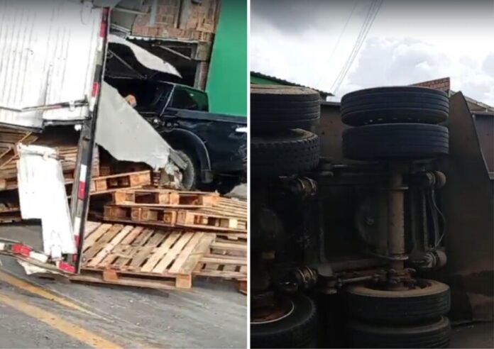 O veículo, que seguia pela avenida, perdeu o controle e tombou, atingindo as frentes de duas casas e dois carros estacionados. A força do impacto destruiu as estruturas residenciais e causou danos aos automóveis.