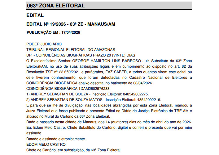 Manaus (AM) ─ A 63ª Zona Eleitoral de Manaus identificou uma inconsistência no Cadastro Nacional de Eleitores envolvendo duplicidade de inscrição, as chamadas “coincidências biográficas”. O edital nº 19/2026, assinado pelo juiz substituto George Hamilton Lins Barroso e publicado nesta sexta-feira (17/04), aponta que um mesmo cidadão possui dois registros eleitorais distintos no sistema.