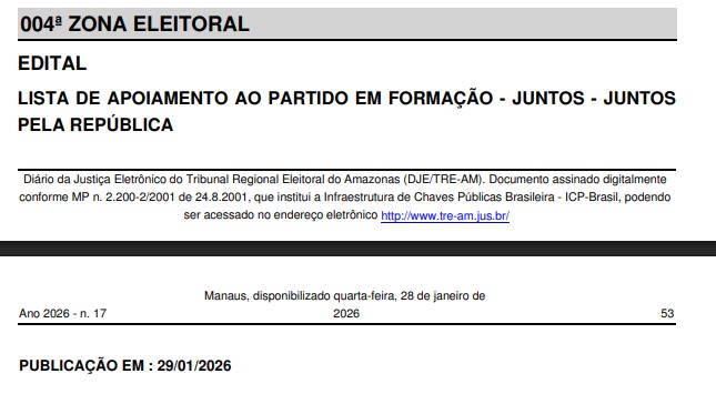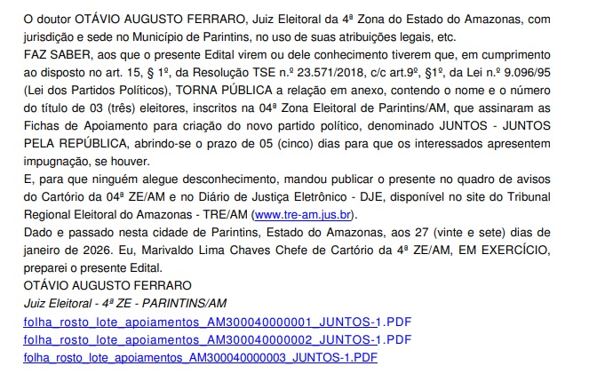 Manaus (AM) – O juiz da 4ª Zona Eleitoral, Otávio Augusto Ferraro, publicou nesta semana o edital que formaliza o apoiamento de eleitores de Parintins (município distante 369 quilômetros de Manaus) à formação do partido JUNTOS – “Juntos pela República”. A legenda é uma das 23 novas agremiações políticas em formação no Brasil.