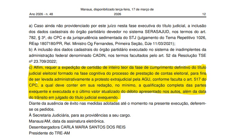O endurecimento da Presidência do TRE-AM sinaliza que o tempo das negociações acabou. Ao autorizar o protesto extrajudicial, a Justiça permite que a União realize cobranças agressivas que mancham a imagem pública do parlamentar.