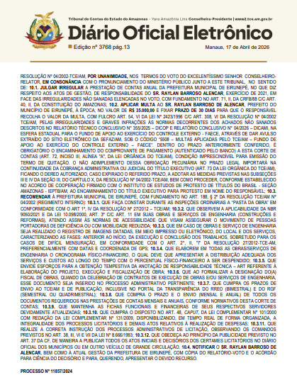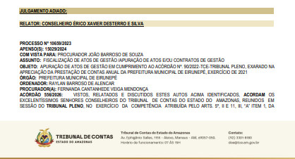 Manaus (AM) ─ O Tribunal de Contas do Estado do Amazonas (TCE-AM) julgou, nesta quarta-feira (22/04), irregular a prestação de contas anual de Raylan Barroso de Alencar, ex-prefeito de Eirunepé (município distante 1.050 quilômetros de Manaus), referente ao exercício de 2021.