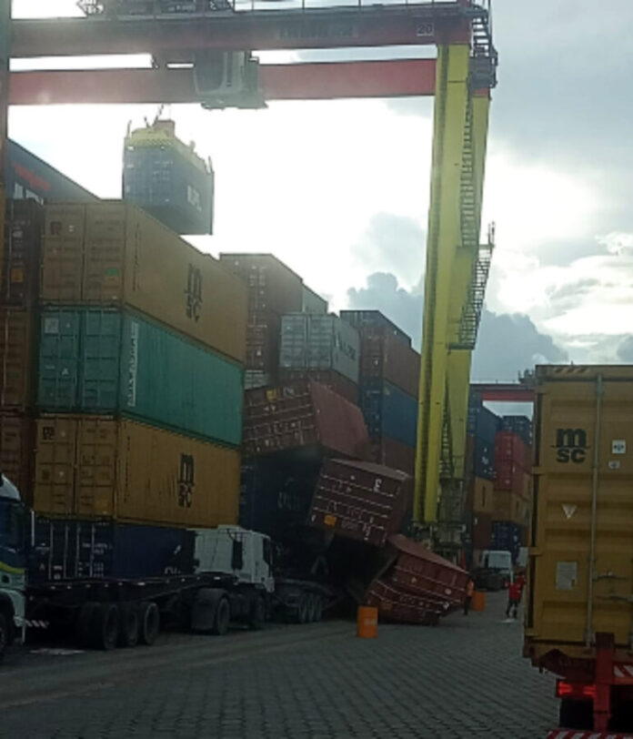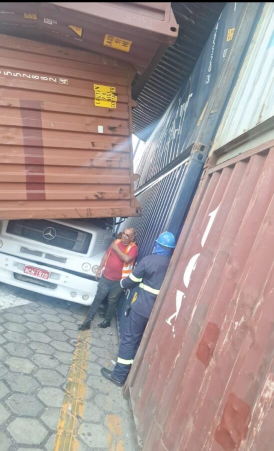 URGENTE | Pilha de contêineres desaba, e motorista fica preso em carreta no porto Chibatão