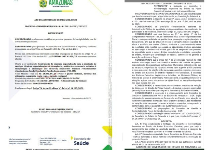 Enquanto o Decreto Nº 52.617, assinado em 06 de outubro de 2025, impôs o “aperto do cinto” em todas as secretarias com o objetivo de “garantir o rigor fiscal”, a Secretaria de Estado de Saúde (SES/AM) autorizou, em 10 de outubro de 2025, a Inexigibilidade (INEX) Nº 050/25.